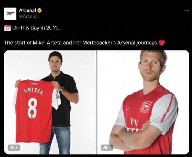 直播吧8月31日讯 在2011年的今天,现任球队主帅阿尔特塔以及默特萨克开启了枪手生涯,阿森纳官推也晒出两人当时的照片作为纪念。