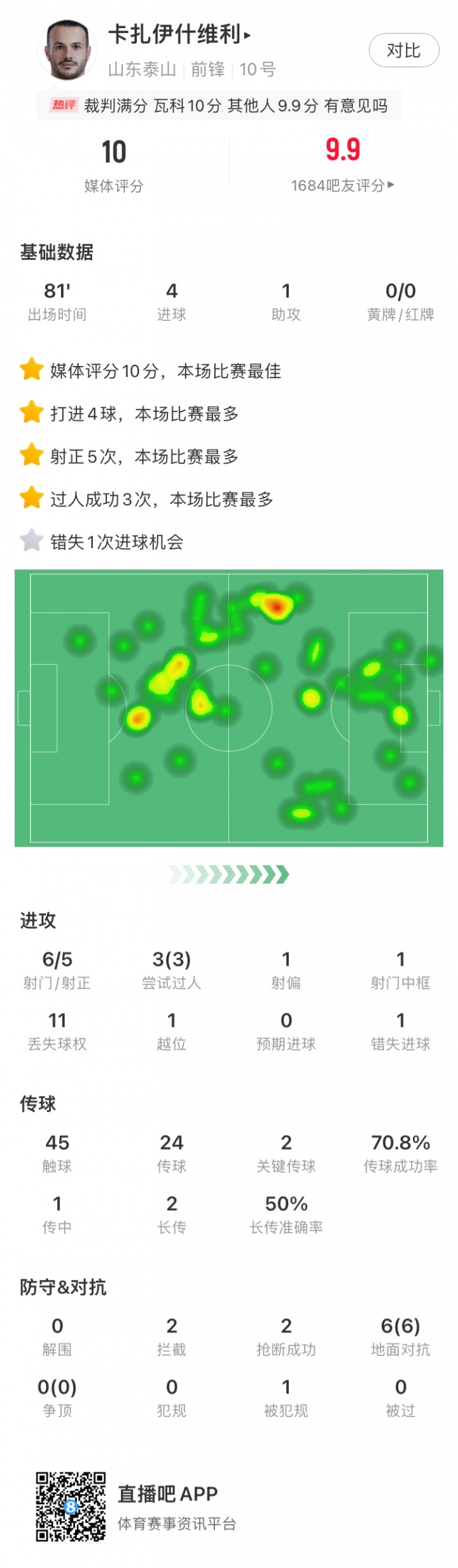 本期提名球员仅有1位——卡扎伊什维利!他面对泰山宿敌国安,打进4球+1次助攻,奉献完美表现!