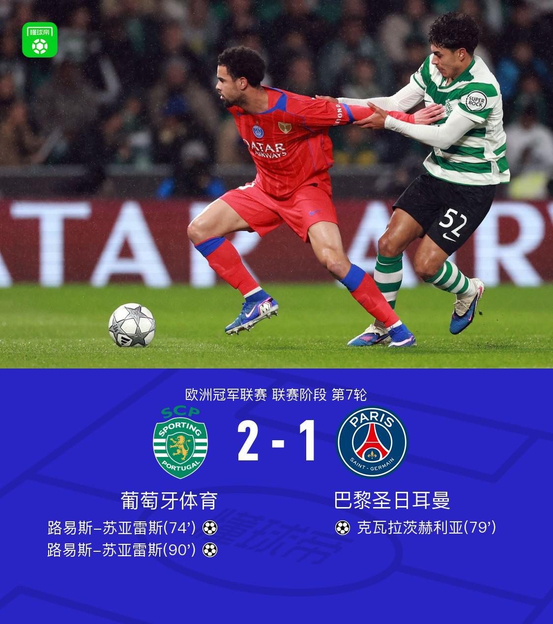 北京时间1月21日欧洲冠军联赛 联赛阶段 第7轮,葡萄牙体育对阵巴黎圣日耳曼。上半场马尤卢犯规在先,扎伊尔-埃梅里头球破门被吹无效,随后登贝莱也因越位在先,努诺-门德斯进球再次被吹掉。下半场登贝莱又一次越位在先,巴黎被连吹三球,随后路易斯-苏亚雷斯后点推射破门打破场上僵局,克瓦拉茨赫利亚调整兜射破门迅速扳平比分,比赛尾声路易斯-苏亚雷斯头球破门绝杀比赛。最终比分葡萄牙体育 2-1 巴黎圣日耳曼。