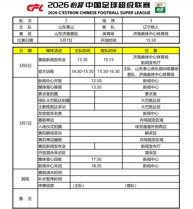 客队辽宁铁人队的发布会将于同日15:15召开,出席的教练与球员分别为李金羽与韩镕泽。两人均曾在山东泰山队效力,此次以对手身份重返济南,将为比赛增添更多故事色彩。辽宁队的赛前踩场安排在15:30-16:30,地点为济南奥体中心体育场内场。
